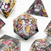 The Liquid Core dice set stands out with its sharp-edged design, ensuring fairness in rolling, paired with the captivating movement of mica within the liquid core. This combination not only looks spectacular but also adds an element of magical realism to your gameplay.